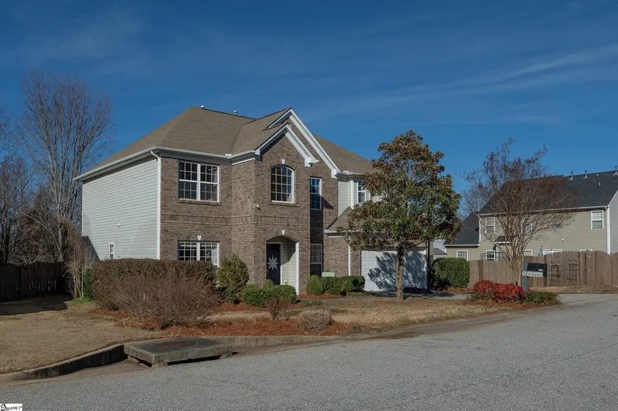 Welcome to this stunning two-story, four-bedroom, two-and-a-half-bath home featuring a stately front elevation with intricate brickwork and a charming arched entry. Inside, the home is filled with beautiful natural light and begins with a grand two-story foyer, flanked by a formal dining room adorned with elegant wainscoting and a versatile den or flex room with nine-foot ceilings—perfect for a home office or sitting room. Designed for entertaining, the kitchen is the heart of the home, boasting a large custom island ideal for gathering, along with custom built-in cabinetry in the breakfast area for additional storage. The breakfast area flows seamlessly to the outdoor patio, creating an effortless indoor-outdoor entertaining experience. Step outside to enjoy the gorgeous private backyard complete with a spacious patio and an impressive outdoor fire pit—perfect for hosting or relaxing year-round. The main level also features a spare bedroom that can serve as a guest bedroom or dedicated workspace. Upstairs, the primary suite is a true retreat, offering a sitting area, tray ceiling, and charming window nooks. The ensuite bath includes split vanities, a separate shower, and a soaking tub. Additional bedrooms are generously sized and thoughtfully laid out. The current owner has made significant upgrades to major mechanical systems, including HVAC systems, water heater, water pressure valve, and garbage disposal—providing comfort, efficiency, and peace of mind for years to come. Located in the desirable Heritage Creek community, residents enjoy exceptional amenities such as a swimming pool, clubhouse, recreational paths, and playground, all while being conveniently close to the popular Heritage Park Railway. This home offers the perfect blend of style, functionality, and community living. This home is in very close proximity to Heritage Park and the Amphitheater and your are only a five minute drive from the popular Downtown Simpsonville, SC and you have quick easy access to I-385.