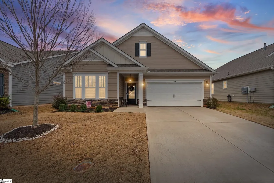 Convenience, comfort, and thoughtful design come together in this beautifully cared-for single-story home. Featuring three bedrooms and a functional open layout, this property is perfectly positioned near I-385, shopping, dining, and major medical centers, making everyday errands and commutes effortless. The private owner’s suite is tucked away at the back of the home and offers a true retreat, complete with dual walk-in closets, space for a seating area, and a spa-inspired bath showcasing an oversized tiled walk-in shower, double vanities with upgraded basins, tile flooring, and quartz countertops. Two additional bedrooms are located toward the front of the home and share a conveniently placed hall bath, offering flexibility for guests, family, or a home office. Main living areas are enhanced by upgraded LVP flooring, crown molding, and an inviting open-concept design ideal for gatherings. The kitchen is a standout, featuring a large quartz island, Brelin white soft-close cabinetry, brushed nickel pendant lighting, recessed lighting, and stainless steel appliances including a gas range. The dining space is filled with natural light thanks to clerestory windows, creating a bright and welcoming atmosphere. Atrium doors lead to an oversized patio overlooking a peaceful backyard, perfect for relaxing or entertaining. Additional features include a gas-burning fireplace, tankless water heater, energy-efficient upgrades, security system, and a two-car garage. This home offers easy living in a location that truly delivers.