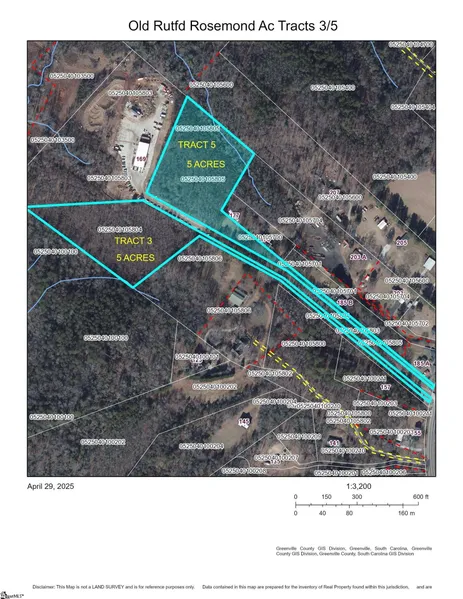 Level, wooded, 5-acre flag lot available off Old Rutherford Road in Taylors. Lots connects to Old Rutherford Road by 10+foot wide by 1350 feet long strip of land. Acreage parcel is minus the access roads is approximately 4.6 acres.
