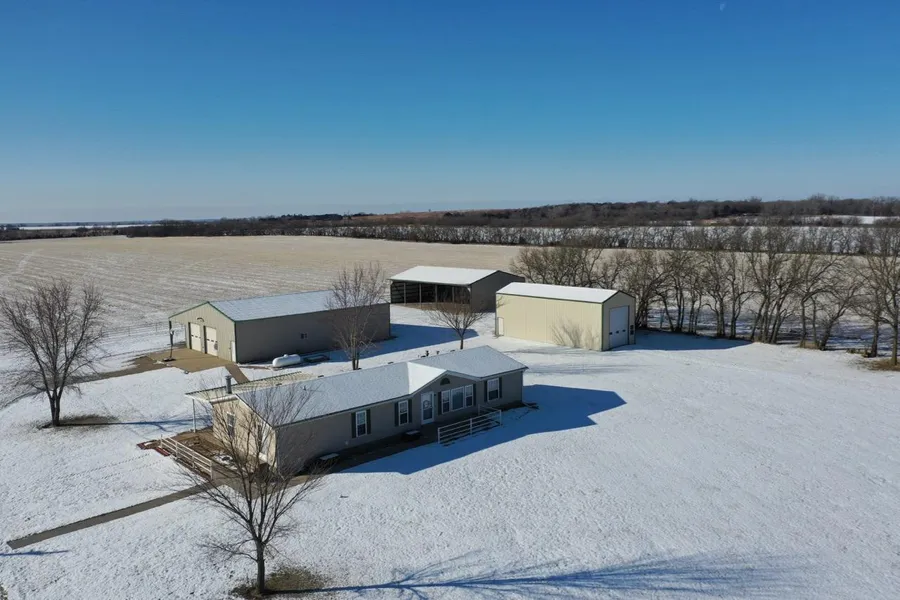 IMPROVEMENTS: The double wide manufactured home was built in 1996 and has 1836 square feet. This 3 bedroom two bath home has two living rooms, a dining area, and a wood burning fireplace. A large kitchen is open to both the dining room area and the living room w/ fireplace. In the master bedroom there re two closets and a master bath with separate tub & shower. The house sits on a permanent foundation and has a front porch and a covered back patio. Other buildings on the property include a 64 x 40 metal building w/ concrete floor, heat, a bathroom, and an additional 15 lean-to all along the south side of the building. In addition, there is a 60 x 40 pole barn open on one side for equipment storage, and another building that is 50 x 25 with a concrete floor and (2) 14 overhead doors adequate for RV parking.