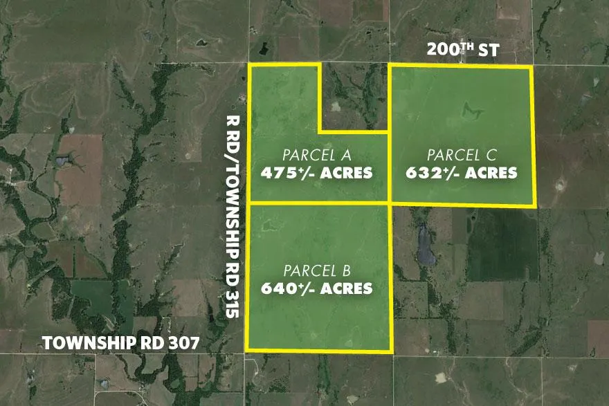 Fantastic opportunity to purchase 3 parcels of land totaling 1,747 +/- acres in Eureka, Kansas. Offered at High Bidder's Choice. Currently used as pasture land; these grounds offer agricultural outbuildings, pipe metal and wire fencing, rolling hills, ponds and shade trees. Zoned Agricultural. Pasture contract for Parcels A, B and C through October 31, 2017. Gross Income: $40,480.00/year ($23 per acre). Mineral rights transfer.