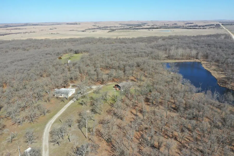 PROPERTY DESCRIPTION: Private Lake Cabin Getaway! This 3 bedroom 2 bath cabin with a full finished walkout basement overlooks a beautiful, clear water lake with a dock. The balance of the property consists of heavy timber, creek, native hay meadow, and a building for storage. The cabin was built in 2000, has 1064 square feet on the main level with a full basement. The main level consists of 3 bedrooms, full bath with separate tub/shower, a fireplace, and a wet bar in the master bedroom. A nice balcony is accessed from the master bedroom and overlooks the wooded backyard and lake. Basement features include the kitchen, living room w/ fireplace, full bathroom, laundry, and a walkout screened in porch. If you like hunting or wildlife, there is a cleared field centrally located on the property that attracts a large amount of Kansas Whitetail Deer and Turkeys. A large building with concrete floor and overhead doors offers the perfect place for tools, ATVs, and all your hunting/fishing items to be stored. You dont see a property like this become available often!