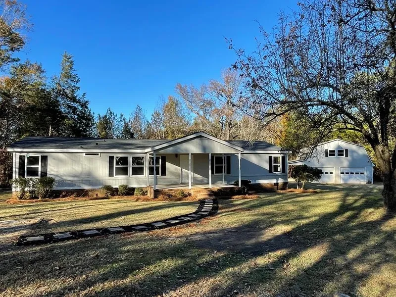 Make your home at a private getaway in the heart of Greenwood, SC. After you enter the property from the ~400 foot driveway, you'll see the completely renovated 3BR/2BA 1728 SF fully detitled manufactured home, along with a huge detached two-story stick-built two-car garage. Your sense of privacy is enhanced by the wooded land that surrounds the property, offering a country living feel just 5 minutes from Greenwood's shopping and dining. The home itself feels completely brand new. New waterproof laminate flooring flows throughout. The kitchen is finished with new quartz countertops, a subway tile backsplash, spacious kitchen sink and stainless steel appliances. The primary suite includes a walk-in closet, large bathroom with a second closet, 67 inch double vanity with quartz countertops, a new shower and beautiful freestanding tub surrounded by subway tile. The guest bath has been upgr...