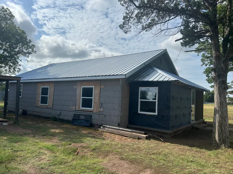 New Roof! Just installed 7/3/2025. New metal siding and new interior pictures of renovation coming SOON! The home sits on 5 lots which equates to 1/2 a city block. The home is currently being restored by the owner. It has new plumbing and wiring. The owner has just installed all new windows and a new solid front door and a glass outer front door. The home consists of a living room, dining room, kitchen with stove and refrigerator, three comfortably sized bedrooms with closets and a large bathroom. The owner will continue to work on the home until it is purchased. His intention is to add new metal siding. A large covered front porch to be added on the southside with new front entry. The price will increase as improvements are completed. This is a solid home that would make a great starter home or investment. With the large lot, there is room for expansion, pets or just room to breathe with no neighbors on either side of the home, because the property extends from corner to corner. This home is a must see for the right individual.