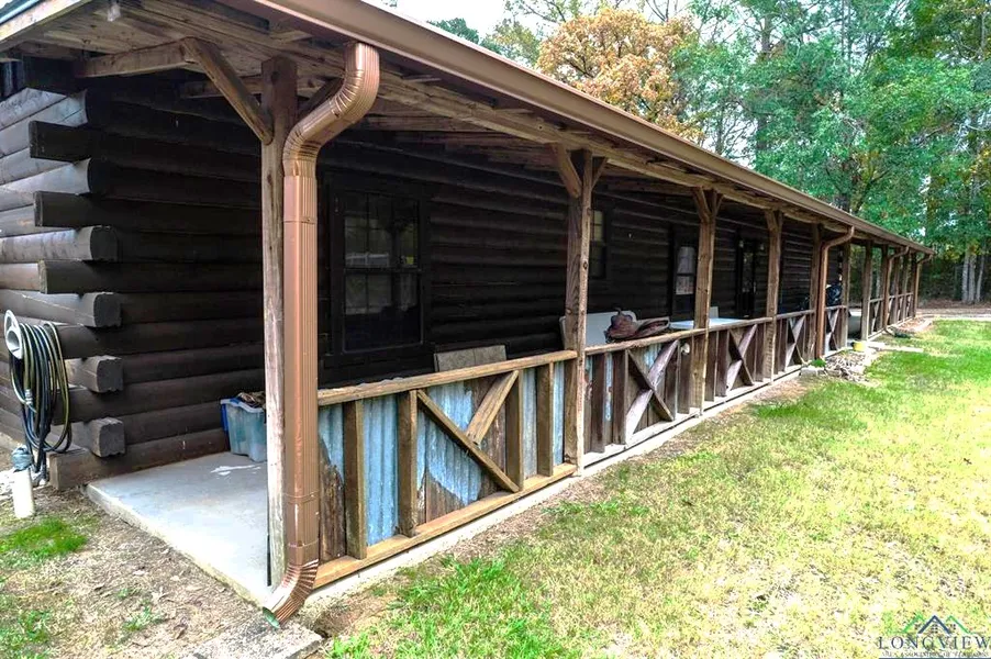 WELCOME HOME! This Rustic Log Home is 3/2 has 2088 sq ft with 2 living areas and a beautiful large fireplace, wooden beams, walls, ceilings and beautiful Texas style tile floors. The kitchen has plenty of counter space and a lot of cabinets. The owner suite is roomy and has his and her walk-in closets. Bring your animals, this property has a barn and fenced area, additional storage with a wooden storage building perfect for all your lawn equipment and tools. Did I mention this property has a perfect concrete covered area for all your outdoor cooking needs. Have a seat on this large front porch and enjoy the peace and quiet. This property is located on a dead-end private road with a private entry way, gate and paved driveway. All of this nestled on 1.8 acres in the Hallsville ISD! --