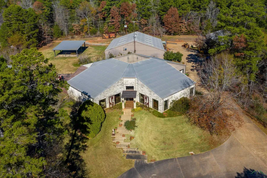 CALLING ALL CAR ENTHUSIAST! 1725 FM 2751 is a unique property in many respects. Situated on 43 +/- acres, the property boasts three ponds, surrounded by woods. This home is not visible from the road providing an immense amount of privacy. The house was designed to accommodate parties and large gatherings and to be a “blank canvas” for the owner to showcase their taste and style, almost like an art gallery. While comfortable to live in, it is a tremendous venue for entertaining with over 20,000 sqft under roof! The construction of the main house is unlike most residences, it is a weld up metal building and none of the interior walls support the roof, allowing huge open areas in the attic for utilities and storage. This home’s design is four 40’ squares put together so as to form a 24’ square atrium in the center, open to the sky for an indoor garden and fishpond. The main house is 6300 +/-sq. ft with a large amount of storage space. Just in the Kitchen are over 30 drawers and lots of cabinets. There is a very large pantry that serves as a separate walk through to the bedroom wing which has three bedrooms each with its own full bath. One even has a “mini kitchen” with a sink, under counter refrigerator and range. The master bedroom is spacious with a luxurious bathroom and two large dressing rooms. There is a very large laundry/storage room with one washer and two dryers as well as a double sink. This home has panoramic views from most rooms with LARGE picture windows. The attic space offers a large amount of storage space and is accessed by stairs and an electric lift. There is a dedicated bar area and a large patio with an outdoor fireplace and natural gas hookup for a smoker/grill. Behind the house is a 1200 sq. ft. covered party pavilion which can easily seat over 100 for an event. Also, behind the house at the “upper pond” is a covered barbecue shed and deck/pier. The barbecue shed has a sink, under the counter refrigerator area, and a large smoker (smoker can do 14 briskets at once). Multiple outbuildings including a 50’ x 150’ metal barn building and a 70’ x 70’ shop building. The south 50’ of the barn is open on two sides and has a gravel floor. The shop has a pit for working on cars. One third of it is air-conditioned. The shop has a small restroom and its own septic tank. One area is set aside as a paint booth. In addition, there is a small 10’ x 10’ “pump house” for the sprinkler system and well pump controls. The acreage on this beautiful property entails grape vines, apple trees, peach trees, pear trees, fig trees, may haw trees as well as some blueberry bushes and berry vines planted around the garden. Water to the garden (not including the sprinkler) comes from the main water supply to the house. The middle pond has an island, connected to the shore with a pier.