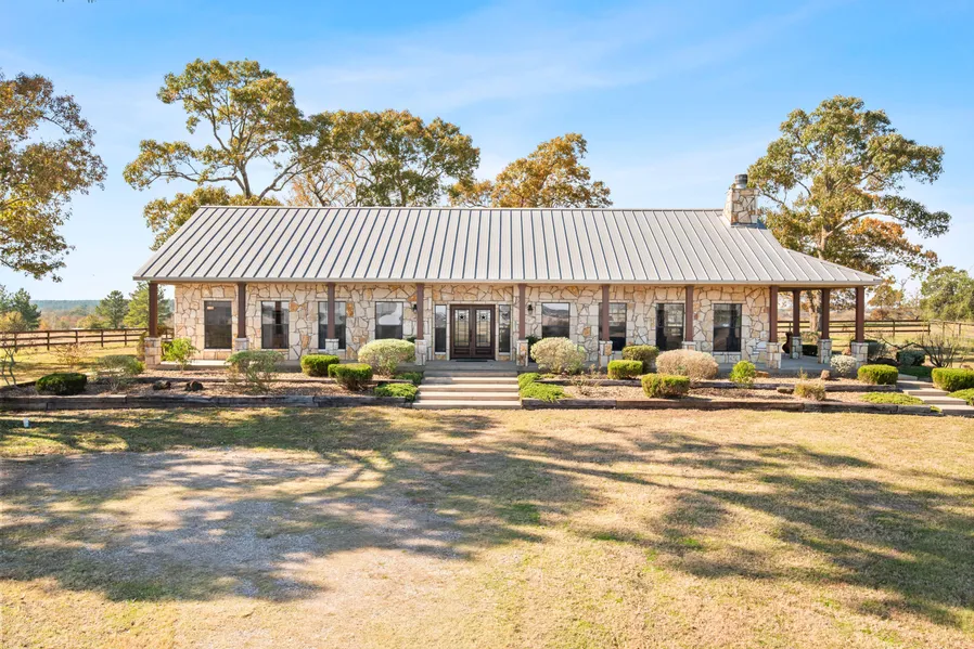 From the gated entry, the road winds through the ranch crossing over an 8+ acre lake to the ranch home. In true Texas style the single-story home, built in 2006, features three bedrooms and three and one half baths, a sprawling great room framed by windows and a full masonry, wood-burning fireplace, scored and stained concrete floors, high ceilings, an all electric kitchen with an island and breakfast bar, two dining areas, and a wonderful dog trot opening to the expansive wrap-around porch and rolling landscape. Large scattered trees and rolling vistas surround this lovely custom home. The detached garage provides space for equipment storage while also offering additional covered parking.