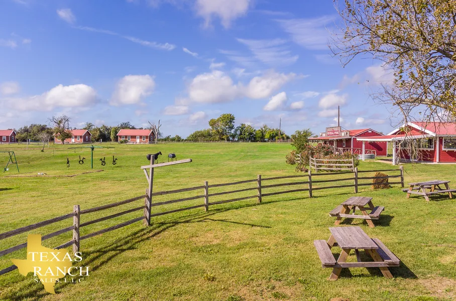 This ranch is ready for entertaining with numerous improvements made to resemble a small country town including a 2,400 sq/ft saloon-style entertainment venue, 900 sq/ft commercial kitchen, a 640 sq/ft office (General Store), bathroom facilities, 2,400 sq/ft horse barn, and an arena (OK Corral). In addition, there are two 800 sq/ft, 2BR/1BA cabins, and two 800 sq/ft, 1BR/1BA cabins, each equipped with a kitchen and furnished with beds and a couch. There are 4 stands for shooting skeet. One electric water well supplies the property with water.