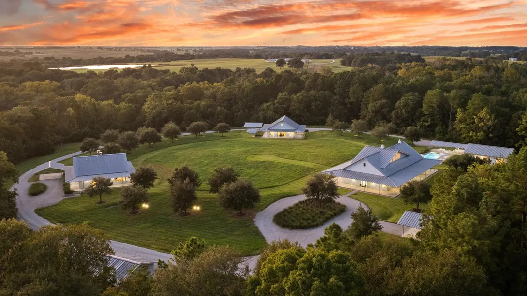 Lastly, we turn back toward the main road that brought us to these woods to a secondary gated entrance leading us down a private secluded road into the residence compound. Pulling in to the left a five-bay insulated garage, and to the center, a ring of structures, four in all. The guest cottage, the bunkhouse, the pool house, and the primary residence are all situated in a circle facing one another within a 75-yard oasis of nature. The center point is marked by a freshly cut zoysia grass path tied to illuminated live oak trees. The topography is gently elevated in the center, providing a perfect amount of privacy between the structures and maintaining a balance of intimacy by proximity without betraying each other's privacy.