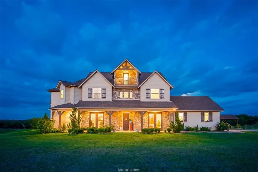 One of a kind Country living with AG Exemption in place! Gorgeous custom home on 11.48 acres with 360 degree views of the lake & rolling hill terrain and only a short drive to BCS, The Woodlands, Houston, or most of Central Texas. Sitting high on a hill, Sophisticated but warm, open & inviting-- This property has it all! Over 5,000 square feet, 4 bedrooms, 3.5 bathrooms, Formal dining, office, game room, a bonus room and a Library room hidden behind bookshelves! Be prepared for large gatherings in the gourmet kitchen with stainless appliances, massive exotic granite island, beautiful custom cabinetry and brand new Herringbone wide plank procain tile in the main living areas. The Master suite retreat overlooks the lake with garden tub, walk-in shower and sauna! Relax in the covered pavilion with views of the sparkling pool with limestone edge, putting green and grass tennis court. Private...