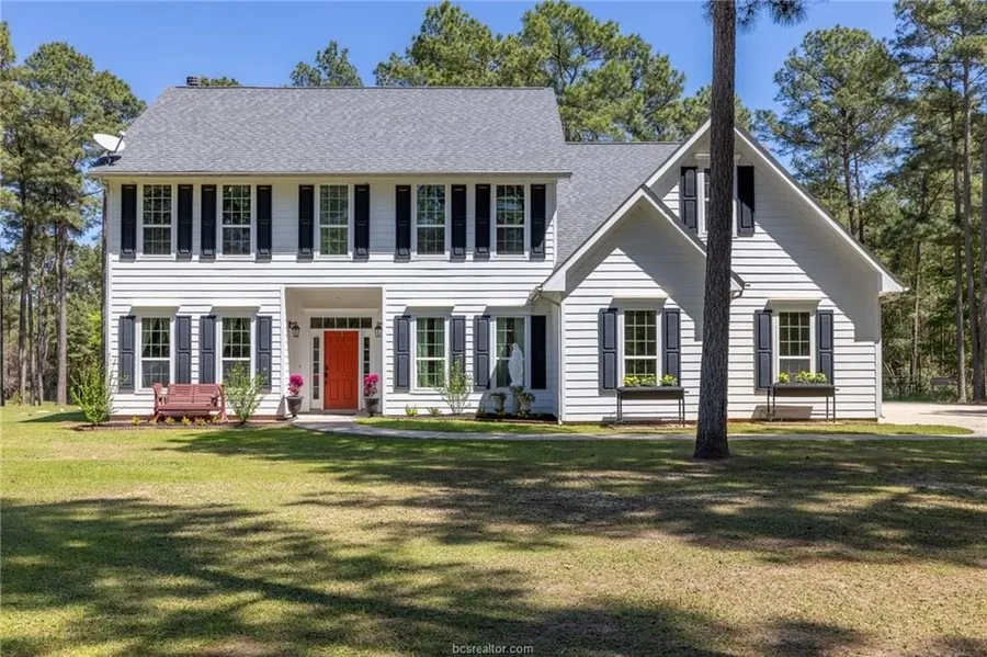 Motived Sellers! Built for homeschooling and homesteading, this wonderful traditional-style home offers a spacious floor plan with 6 bedrooms and 4 bathrooms. The garage has been converted into a chapel and a utility/storage room. On the first floor, there is 1 bedroom and 1 bathroom, while the second floor features the primary bedroom and bath, 4 additional bedrooms and 3 bathrooms, office, and bonus room. The large screened-in porch spans the back of the home, providing ample space for outdoor relaxation. The property also includes a schoolroom and a tool shed located just off the back of the home, offering easy access and flexibility for various needs. The land is surrounded by towering pines and includes a stocked pond, a barn, and an orchard with plum, peach, apple, and orange trees, as well as grapevines—all plumbed with irrigation for convenient watering. This property is located within the Anderson-Shiro ISD, just 45 minutes from Tomball and The Woodlands. Timber exempt. High speed internet on site.