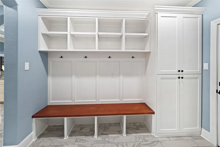 Interior highlights included upscale finished: Texas limestone & brick exterior, coffered ceilings.