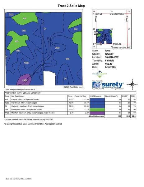 We are pleased to present 405 acres M/L of quality Grundy County farmland available through a sealed bid auction. The farm is being offered in five individual tracts, providing an excellent opportunity for farmers, investors, and landowners to expand or begin their land holdings in one of Iowa’s premier agricultural regions. See other listings for more information! Bids Due: September 1, 2025 Tract 1: 82.6 tillable acres M/L | CSR2: 88.6 Tract 2: 85 tillable acres M/L | CSR2: 87.9 Tract 3: 74.56 tillable acres M/L | CSR2: 89.3 Tract 4: 78.5 tillable acres M/L | CSR2: 68.1 Tract 5: 81.8 tillable acres M/L | CSR2: 61.5 All tracts offer productive soils with strong farming history. Tracts may be bid on individually or in combination. Don’t miss your chance to own a part of this rare offering in Grundy County, IA.