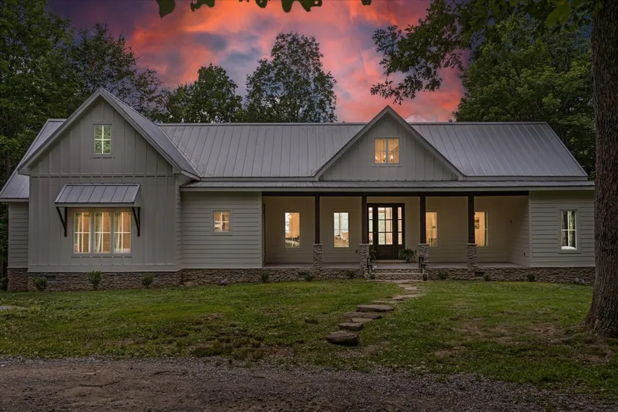 This stunning home boasts luxurious features and a serene setting. Step inside to find quartz countertops, custom Alder cabinetry, white oak and custom tile flooring. The master suite features a free standing tub, a custom black tile shower, and a private deck. Enjoy the warmth of the gorgeous stone fireplace with a 150 year old barn beam mantle. The kitchen is a chefs dream with a farmhouse sink, 6-burner range with double ovens. The house features a Jack and Jill bathroom, vessel sinks situated between spacious 2nd and 3rd bedrooms. The standing seam metal roof, stone and hardy board siding add to the homes charm. Home features underground electric, dual fuel efficiency heat and air. Outside, the home is enveloped by nature, offering privacy and tranquility. Relax or entertain from main deck while taking in your personal bluff view and breath taking sunsets.