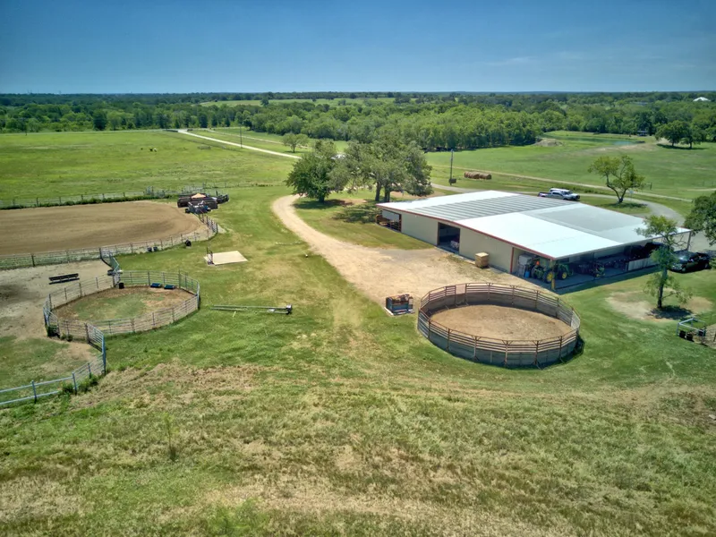 Over 10,000 sq feet of barn and home combined! This 2/2 Custom Barndominium has a gorgeous finish out with stainless steal appliances, granite counter tops, tall ceilings and an excellent floor plan. The immaculate barn is ready to stall 8 horses each with their own run to a capacity of 16 head. Enjoy riding in the outdoor arena complete with roping chutes or one of the 2 round pens. Horse walker also on property to keep horses in top shape. This very diverse property offers 22 acres of improved pastureland with remaining acreage offering excellent hunting. Relax fishing the large 2 ac tank, stocked with bass and perch or let off some steam at the firing range. There are multiple turn outs for rotational grazing. Property also includes 3 water wells and 3 septics. Great location with a straight shot approx 30 miles East of San Antonio. Possibly would make a great wedding venue or other outdoor retreat.