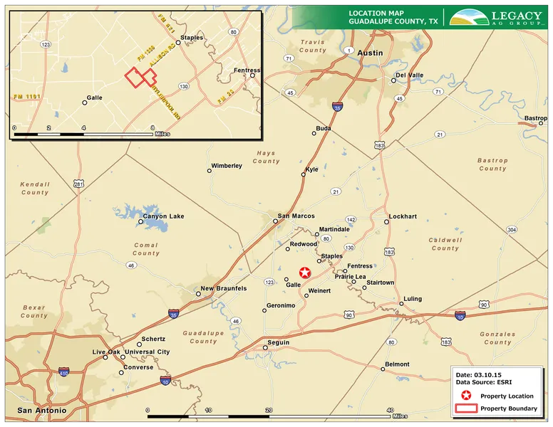 This 515-acre tract of land lies between Austin and San Antonio, in one of central Texas fastest growing areas - in the corridor between State Hwy 123 and TX-130 Toll Highway. It is certain to appreciate in value as Austin, San Antonio, and the towns between them continue their impressive growth. Located approximately 13 miles southeast of San Marcos in Guadalupe County, the property is one of the last farms of its size available for sale in this area.
