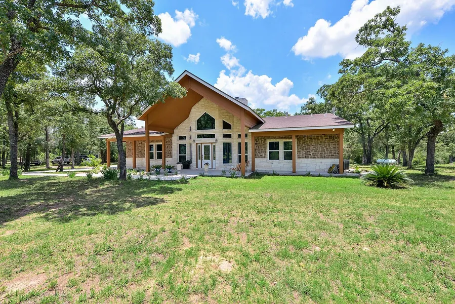 Set just 15 miles outside of Seguin, TX this 7.5 acre property boasts a one of a kind custom home. At 3112 sq feet it includes 3 large bedrooms, each with its own full bath and walk-in closets. The massive great room boasts 20' ceilings and a massive double sided floor to ceiling flagstone fireplace. Made for entertaining, the house include an on slab wrap-around porch, plentiful windows, beautiful natural travertine floors. The kitchen included a gas cooktop, built in microwave and oven, a custom built in pizza oven, custom cabinets, and granite countertops. The master suite includes a large walk-in shower, garden tub, double vanity, and a large walk-in closet.