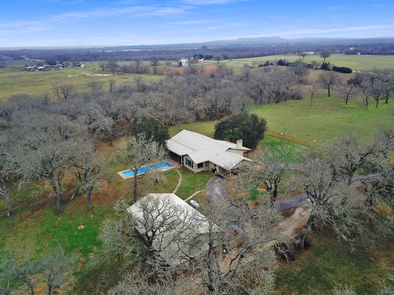 Turn key well maintained/manicured 40+ acre ag exempt ranchette near Seguin Texas, 2600+ 4 bed 2 bath single story home (updated with concrete countertops, butcher block island, stainless steel appliances, gas stove, remodeled bathroom, updated windows, hardwood and Saltillo flooring), 2 car garage with small 320+ sq ft apartment, in ground swimming pool (9'6" by 36), covered back porch, 3000 sqft enclosed metal workshop with electricity, concrete floor, and rollup doors, 24x42 equipment pole barn with four bays, 30x30 barn with large chicken coop, 40x24 four stall horse barn, two water wells (one solar), cross fenced for ag use (ag exempt), hardwood trees with back pasture and water tank, and 70x70 irrigated garden and orchard. Property is conveniently close to town, near 130, and major metroplexes for commuting and other needs. Livestock, water rights, seller mineral ownership possibly can convey.