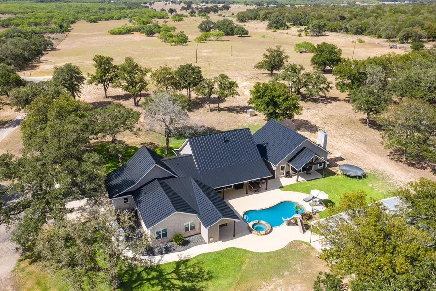 Envision yourself at this rural ranchette that offers farmhouse style, unparalleled functionality, and luxurious amenities, all with rustic surroundings. Nestled within towering mature oaks, this ag-exempt 75.324-acre property offers a 5-bedroom, 4 full bath, 2 half-bath homestead that is tastefully updated. With a flexible open plan, the kitchen creates warmth and practicality at the heart of the home. Custom cabinetry, a farmhouse sink, Frigidaire appliances, a large island, and bountiful natural light complete this spacious, entertainer's kitchen. The oversized owner's suite features a sizable bedroom with an elegant bathroom suite, equipped with dual sinks, custom cabinetry, and a meticulously-designed walk-in shower suitable for a daily spa experience. Designed for entertainment, the home's open plan provides plenty of room to host your family and friends comfortably. With multiple entertaining spaces available, the main living area, oversized game room, and outdoor spaces are prefect for intimate get-togethers or large gatherings. The well-appointed game room includes a large wet bar, fireplace, and plenty of space to relax. The premier quality of life extends to the outdoor living, providing amenities for every member of the household with a fully-equipped kitchen, heated pool, hot tub, 24'x32' shop, and 24'x32' carport. The discerning eye will recognize and appreciate the high-quality fixtures and finishes throughout. This technologically integrated home includes three NEST thermostats, LED lighting, Sonos surround sound, Blink security system, Brilliant smart home system, and GVEC fiber optic internet. Enjoy pristine water for your morning coffee or tea with whole-house two reverse osmosis systems, pellet ice maker, and so much more! Option to purchase adjacent 30 acres shown on the survey. The upgrades are too numerous to list in full. This luxury estate needs to be seen to be fully appreciated!!