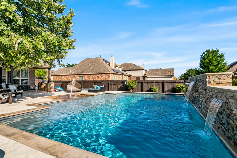 Can you see yourself diving into this gorgeous pool on a hot summer day or grilling outside with your family and friends? Maybe sitting outside by your pool with the beautiful lighting and fountains and letting the day melt away. Or sipping your morning coffee in your hot tub. Wait there is more in this great backyard! A great natural gas fire pit, a place for your lazy summer naps on your hammock and still more room to run and play on the side. Walk into a home with soaring 10ft ceilings along with 4 bedroom 3.5 bath, study, game room, formal dinning and tons more! You will love the stone fireplace as the focal pt. of the family rm. Open kitchen begs for a chef with the stainless appliance and gas range. Grand primary suite is located upstairs. Everyone will love the oversized 3 car tandem garage The water softener will keep your appliances and glass sparkling. Minutes away from...