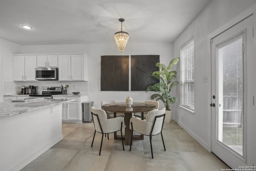 Welcome to this beautifully updated 4-bedroom, 3-bath home located in the desirable community of Cibolo, featuring many upgrades throughout. The home showcases updated tile and wood flooring, along with renovated bathrooms enhanced by modern finishes and new hardware. The spacious kitchen stands out with marble countertops, stainless steel appliances, and generous cabinet and counter space, making it ideal for everyday living and entertaining. The open-concept layout flows effortlessly into the main living areas, creating a bright and inviting atmosphere. Upstairs, a large loft offers versatile space for a game room, media area, or second living area. The expansive primary suite provides a private retreat with a double vanity, separate shower, and soaking tub. Secondary bedrooms are well-sized and thoughtfully laid out. Step outside to enjoy the large backyard, perfect for relaxing or hosting gatherings. Community amenities include a neighborhood pool, and the home is conveniently located near Randolph Air Force Base, as well as shopping, dining, and entertainment options.