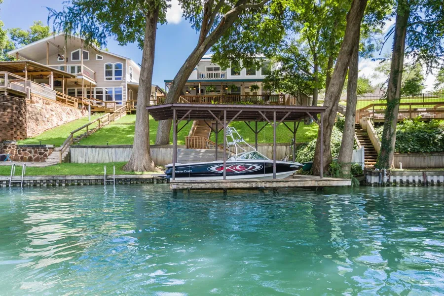 Amazing lake house sitting on prime, improved waterfront on the popular Lake Dunlap. Improvements include retaining wall and boat house with electric lift. Large covered deck provides beautiful views of the lake and offers large area for entertaining. Outdoor kitchen with custom tile countertops, under cabinet storage and large sink. Open concept floor plan and large windows throughout creates tons of natural light and provides exceptional lake views. The 3232 sqft home offers 4 bedrooms, 3.5 baths, loft area, and large bonus area over garage that could be used as a 5th bedroom. Features dual master suites, one on each level. HVAC recently installed upstairs and downstairs in 2014. Offers a 2 car oversized garage, and additional covered parking for a 3rd vehicle, along with covered dry boat storage. This incredible home rests by the clearest waters of any of the areas river style lakes, and is only minutes from downtown, making this a perfect lifetime retreat.