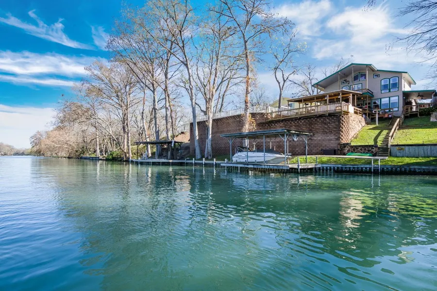 Prime waterfront on one of the clearest sections of Lake Dunlap. 3 tiered decks cascading to waterfront are idyllic for beautiful views, entertaining and great sunning areas. Outdoor kitchen with granite countertops, Weber grill, refrigerator, and built in sink that were all installed in 2015. Fully remodeled (2015) open concept kitchen which shows off the beautiful views of lake from kitchen and living areas. Includes soft close cabinets, bamboo floors, and slate throughout the common areas. Large windows in back of the house create tons of natural light and views across the lake to uninhabited land with abundant wildlife. Master bedroom with French doors to balcony and large windows allows for privacy and views from sleeping area, large master bedroom walk in closet and bathroom with double sink and vanity. 2015 remodeled guest bathroom(s), and large flex room in front of house with fireplace. Oversized 3 car garage with built in cabinets Minutes from downtown New Braunfels, Wurstfest, and easy access to I-35, this makes an excellent permanent home or income property.