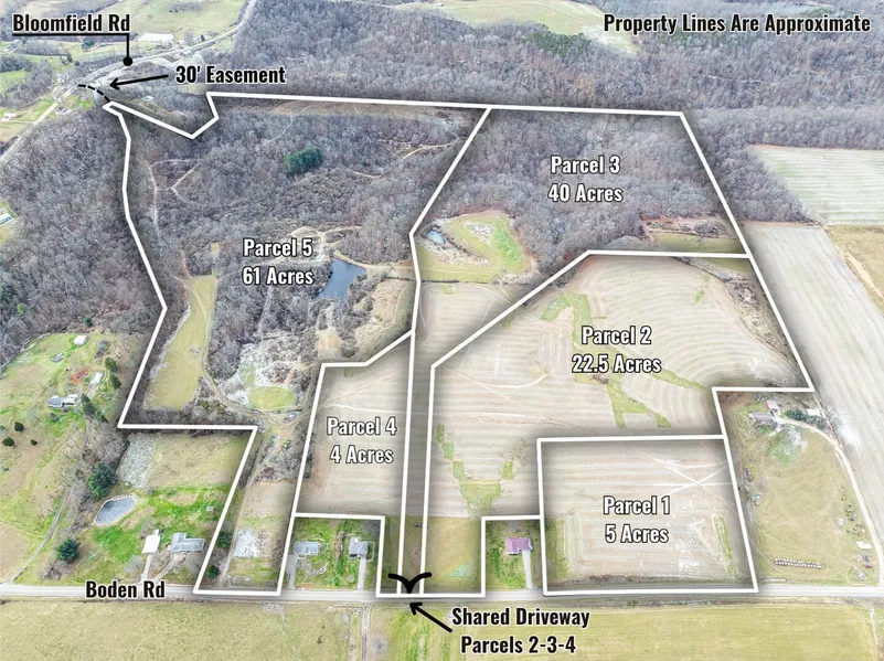 Parcel 5 features an established gravel driveway and an additional 30-foot access easement.