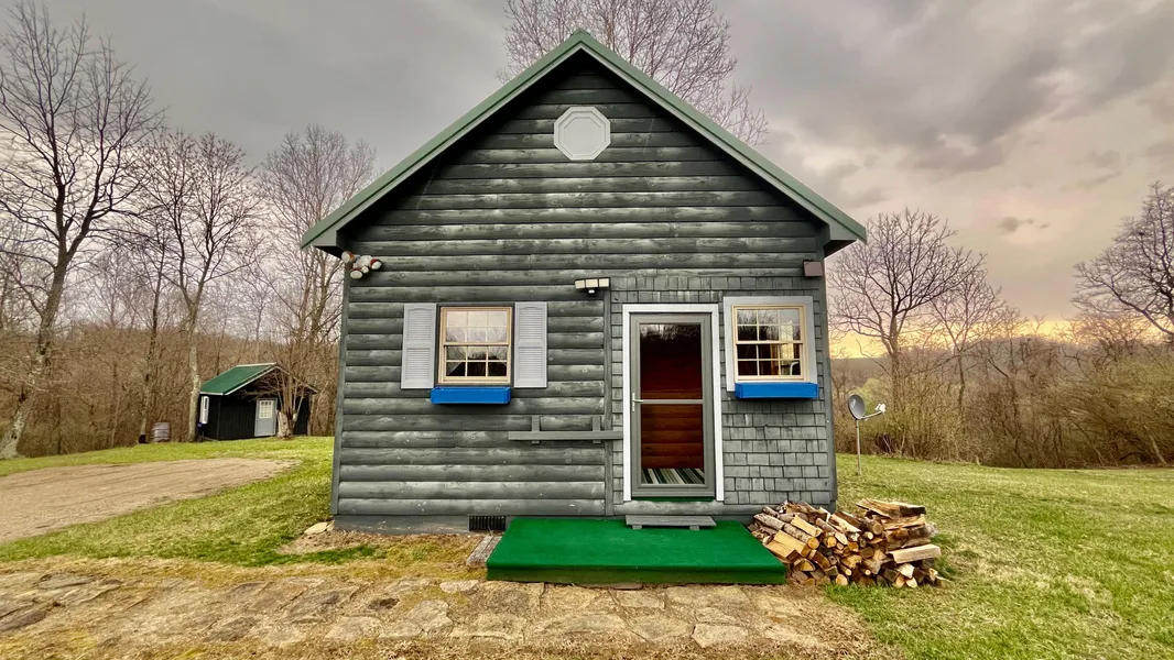 The cozy 24x18 two-room open floor plan home features a loft bedroom, a full bathroom with a stand-up shower, and an open kitchen and living area with appliances included. A mudroom entrance, private well and septic, wood burner, energy-efficient heat pump unit for heating and cooling, and charming cedar vaulted ceilings add to its appeal.