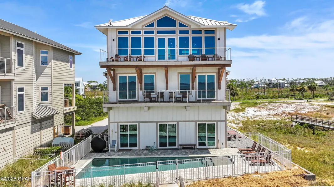 GULF FRONT GRANDEUR WITH HEATED SALTWATER POOL OVERLOOKING THE WHITE SAND BEACHES OF CAPE SAN BLAS! Experience luxury & elegance located at the most desirable end of the Cape with its wide beaches and slow, peaceful pace. This 8BR/8.5BA beachfront retreat at 149 Sapodilla Ln is designed for gatherings, comfort, and breathtaking views. The third-floor main living area is surrounded by walls of windows and soaring vaulted ceilings, filling the open-concept layout with natural light. The chef's kitchen features granite counters, modern appliances, a breakfast bar with island storage, and high-end finishes. Dine with sweeping Gulf views inside or step onto the expansive deck with contemporary cable railing. This level also includes a primary suite and half bath. On the second floor, two Gulf-facing suites boast private balconies, double vanities, and spa-like marble showers. Two additional bunk rooms, each with ensuites, provide the perfect retreat for the younger crowd. The ground floor offers a second living area, direct boardwalk beach access, and another Gulf-front suite opening to the poolside patio, plus two more ensuite bedrooms. An elevator connects all levels for convenience. Step outside to the heated saltwater pool overlooking the shoreline, an ideal place to relax or entertain. Already income-producing, this home is offered fully furnished and turn-key. Soak in the salt air breeze with morning coffee on the porch, launch a kayak from the beach, or fish along the sugar-white, pet-friendly shoreline. Spend afternoons by the pool with panoramic Gulf views and unwind each evening as the sun sets over the horizon. Cape San Blas also offers paved biking and walking trails, horseback riding on the sand, and easy access to dining, shopping, and entertainment. Built for beachfront living and move-in ready, this home is truly one of a kind. Call today for your private showing!