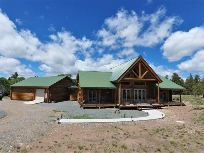 Contemporary custom log cabin within the Blue Mesa Subdivision, but this holding is not part of the Blue Mesa Homeowners Association, so no HOA regulations or dues. The cabin sits on 35 acres up on a hill giving you captivating views in every direction. Exterior features include a fenced backyard, storage shed with woodshed, full RV hookup for your guests, covered decks, and an attached 3 car garage. The property is serviced by a well that has been permitted for domestic, livestock, and one acre of lawn and garden use. The 2,528 square foot cabin is beautifully done inside, giving you 2 bedrooms and 2 baths, open kitchen/dining/living, and a large loft for flex space to use for whatever you need. The cabin utilizes forced air heating and a cozy wood-burning stove. The cabin showcases tongue and groove ceilings throughout, Hickory wood floors in the kitchen and living areas, gorgeous til...
