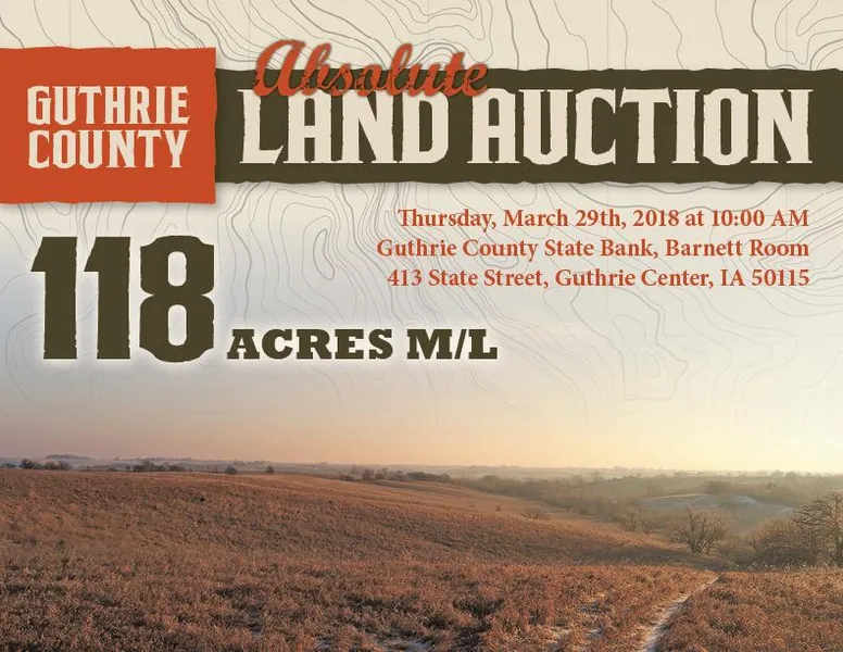 Peoples Company is proud to present 118 acres m/l of Guthrie County farmland that will be sold Absolute to the highest bidder at a live public auction on Thursday, March 29th, 2018. The auction will take place at 10:00 A.M. at the Guthrie County State Bank (Barnett Room) in Guthrie Center, Iowa. Farm includes approximately 97.61 cropland acres carrying a CSR2 of 56.8. Primary soil types include Shelby, Sharpsburg, and Colo silty clay loams. Additionally, there are two separate CRP contracts (CP-1 & CP-4D) with an annual payment of $8,337 (65.37 acres with an annual payment of $7,862 enrolled until 2020 and 3.91 acres with an annual payment of $475 enrolled until 2019). The farm would be a great add-on unit to an existing operation or an affordable purchase for a Beginning Farmer / Investor. This versatile property has a blend of income with future uses including CRP re-enrollment, livest...
