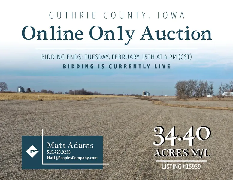 Offering Guthrie County, Iowa farmland through an ONLINE ONLY auction where all bidding must be done online through Peoples Company's bidding application. Bidding is currently LIVE and will remain open until Tuesday, February 15th, 2022 at 4:00 PM Central Time Zone (CST) with closing taking place on or before Friday, March 25th, 2022. A bid placed within 3 minutes of the scheduled close of the auction will extend bidding by 3 minutes until all the bidding is completed. If you plan to bid, please register 24 hours prior to close of auction. Under no circumstances shall Bidder have any kind of claim against Peoples Company or its affiliates if the internet service fails to work correctly before or during the auction.