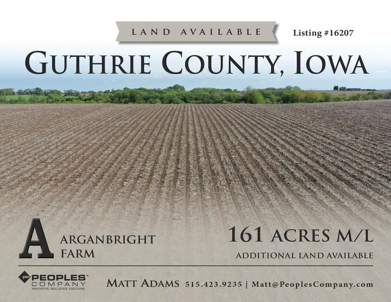 Peoples Company is honored to represent the sale of 161-acres known as the Richard Dick Arganbright Farm in Guthrie County, Iowa. The Arganbright Family is an established name in the area with deep family roots and a family tree that consists of 10 siblings and over 50 nieces and nephews. This farm has been a part of the Arganbright family heritage for several decades and the first time it is available for sale since the family took ownership.