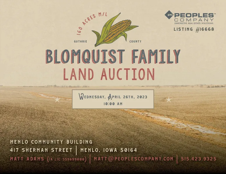 Guthrie County, Iowa Land Auction – Mark your calendar for Wednesday, April 26th, 2023 at 10:00 AM! Peoples Company is pleased to represent the Blomquist Family members in the sale of 160 total acres m/l located three miles northeast of Menlo, Iowa. The farmland consists of a total of 117.54 M/L FSA tillable acres with approximately 108 acres currently in production and a CSR2 soil rating of 67.6. The primary soil types include Sharpsburg silty clay loam and Colo-Judson silty clay loam. The balance of the acres are made up of well- maintained grass waterways, pasture acres, a building/acreage site, timbered draws, and approximately 4 acres of road right-of-way. The property includes an older two-story home built in 1900 with four bedrooms and one bathroom. There are two wells on the acreage site located immediately east of the house.