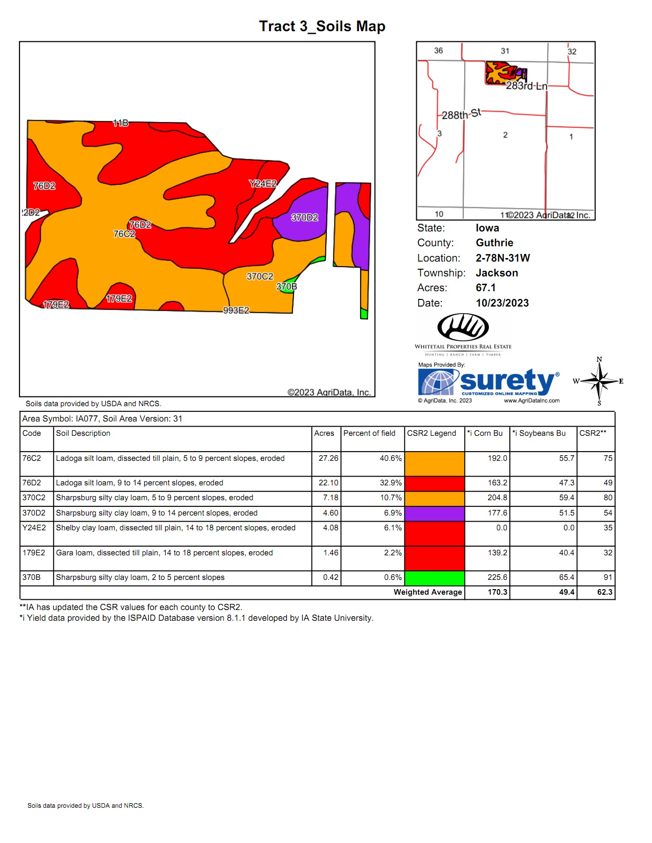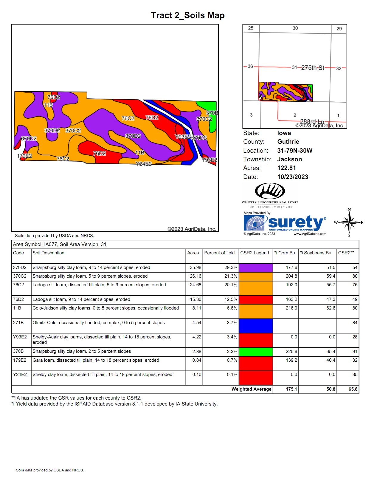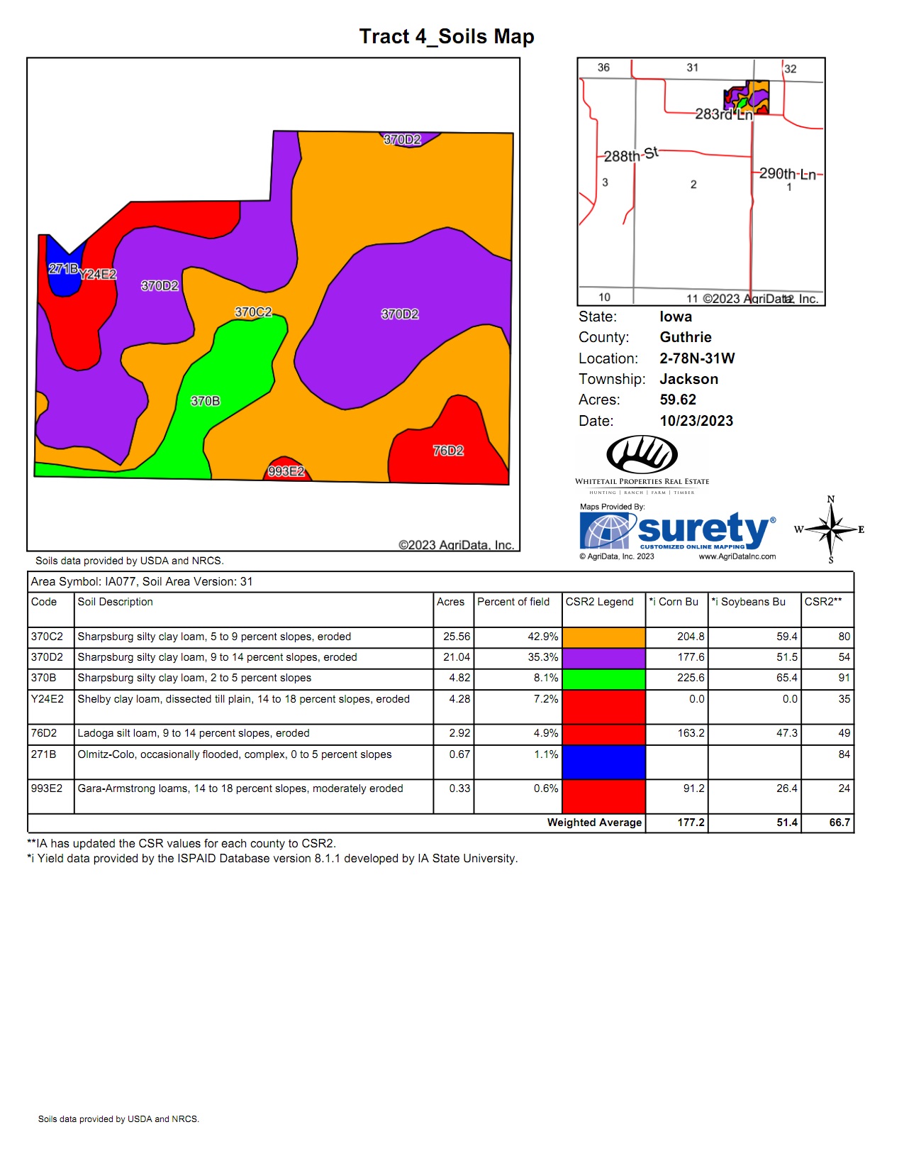 This tract offers 122.81 FSA tillable acres with a weighted average CSR2 of 65.8 which is well above the Guthrie County average of 61.4. The primary soil types are Sharpsburg silty clay loam and Ladoga silt loam with 5% - 14% slopes. The farm is more than 94% tillable with a network of manicured waterways and buffer strips allowing excellent water drainage. There are field entrances on both the south and west sides of the farm giving opportunity for crop division. There is also a shared pond in the SE corner of the farm.