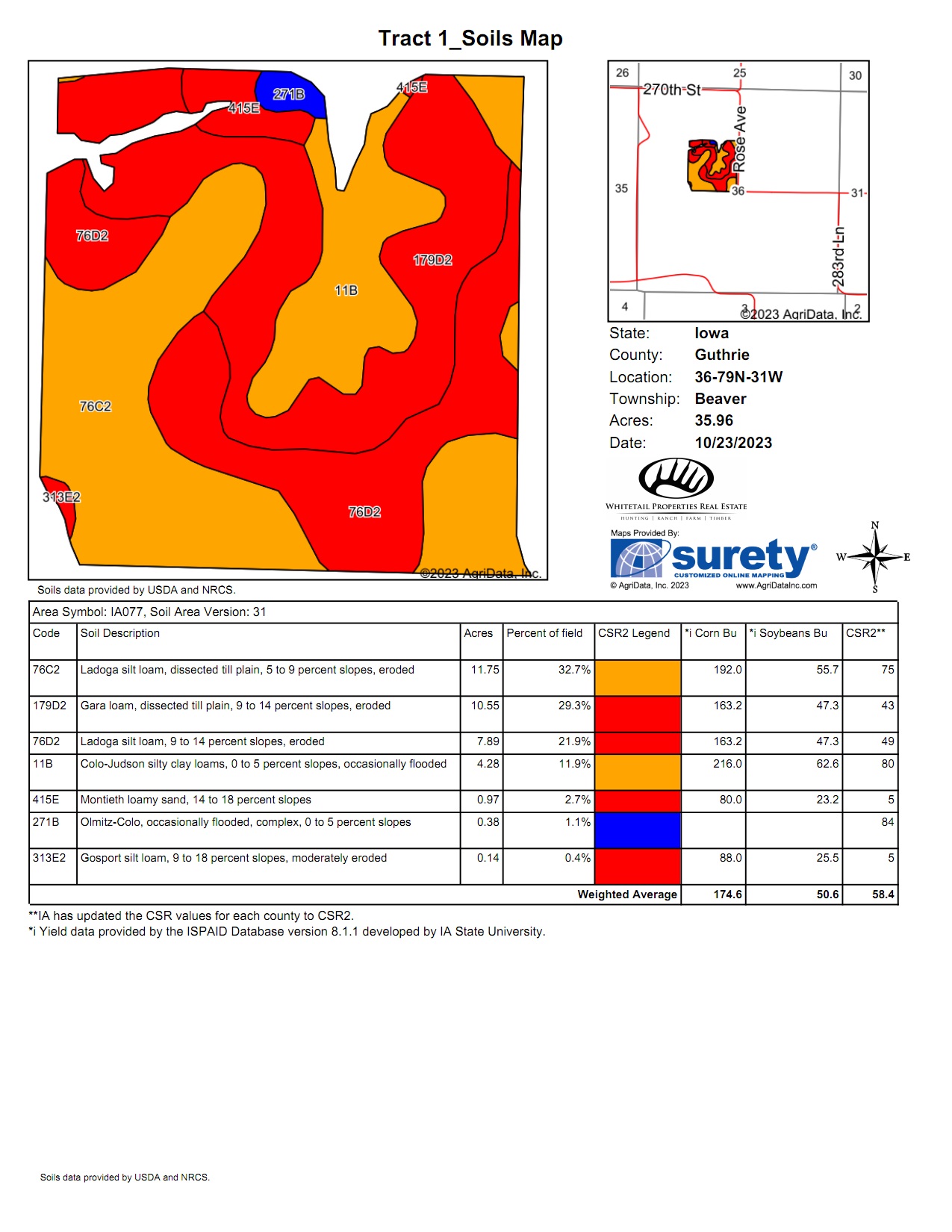 This tract offers 35.96 of income producing FSA tillable acres with a weighted average CSR2 of 58.4. The farm is predominantly tillable with some terraces and mowed buffer strips to allow for sufficient water drainage. The farm is adjacent to good stands of mature timber and timbered draws that connect larger tracts of timber in the area. Due to the proximity of the neighboring timber, this farm would offer deer and hunting opportunities for the land buyer looking for a property with income and recreation. There are two field entrances into the farm off Rose Ave at the north and south ends. There is also a potential building site for a home or machine shop in the NE corner of the property.