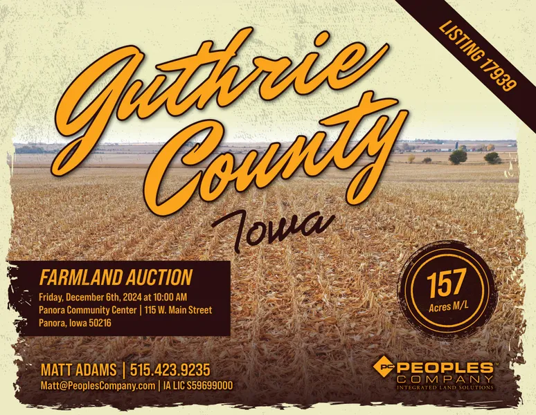 Guthrie County, Iowa Farmland Auction - Mark your calendar for Friday, December 6th at 10AM! Peoples Company is pleased to be representing the Marshall E. Hathaway Trust in the sale of 157 acres m/l located 3.5 miles east of Panora, Iowa on the Guthrie / Dallas County line. Situated in Section 36 of Cass Township, this tract features 149.36 FSA tillable acres carrying a CSR2 soil rating of 84.6. Prominent soil types include Clarion loam, Webster clay loam, and Canisteo Clay loam.