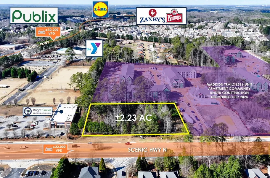 The Property is vacant land and consists of a single parcel totaling 2.23 acres. The Property is immediately adjacent to a retail plaza including Dunkin, Pep Boys, and a multi-tenant retail building. The Property has almost 400 of frontage on Scenic Highway, benefitting from access and visibility to traffic counts of 22,000 vehicles per day. Retail demand generators in the area include Publix, Lidl Grocery, Hobby Lobby, Sprouts Farmers Market, H&M, Sephora, Zaxbys, Wendys, Dunkin, Pep Boys, Crunch Fitness, Extra Space Storage, numerous restaurants, and more. The Property is zoned General Business, C-2, which allows for many commercial uses including restaurant, retail, office, and self-storage (special use).
