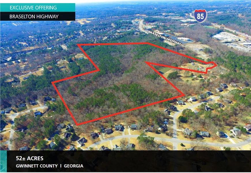 The property is 52 acres in Gwinnett County on Braselton Highway. Close to I-85 in the Mill Creek High School district and the Mall of Georgia.
