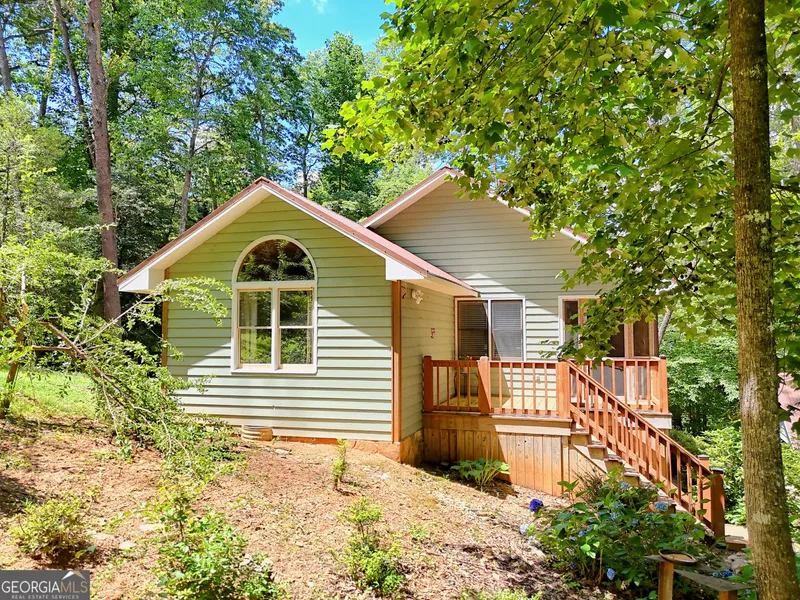 Superb location! Across the street from beautiful Lake Burton! 20 minutes to downtown Helen and Clarkesville. 25 minutes to Clayton. Discover the perfect mountain cottage! This home offers the mountain atmosphere you desire. The elevated great room features vaulted ceilings, and wood floors, highlighted by a stunning floor-to-ceiling stone fireplace that adds warmth and makes you long for winter snow. Two bedrooms provide spacious sleeping areas at either end of the home. One bedroom opens onto a secluded backyard, ideal for a private deck with a hot tub, while the other leads to an impressive screened-in porch, complete with a large stone fireplace-a perfect spot to relax and enjoy the mountains. Wrap-around porches ensure easy access to the outdoors from various parts of the home. A stone-walled carport offers a secure space for your car and a boat. There's ample flat land across the driveway, which is perfect for a garage/ workshop, a game or playard area, or a garden. Enjoy the outdoor amenities, including fruit trees and a fire pit for warm summer evenings. This home is ideally situated for potential short-term rentals, given its proximity to Lake Burton and the public marinas. It's easy to keep a boat and enjoy all that the lake has to offer! This is the home you've been searching for!