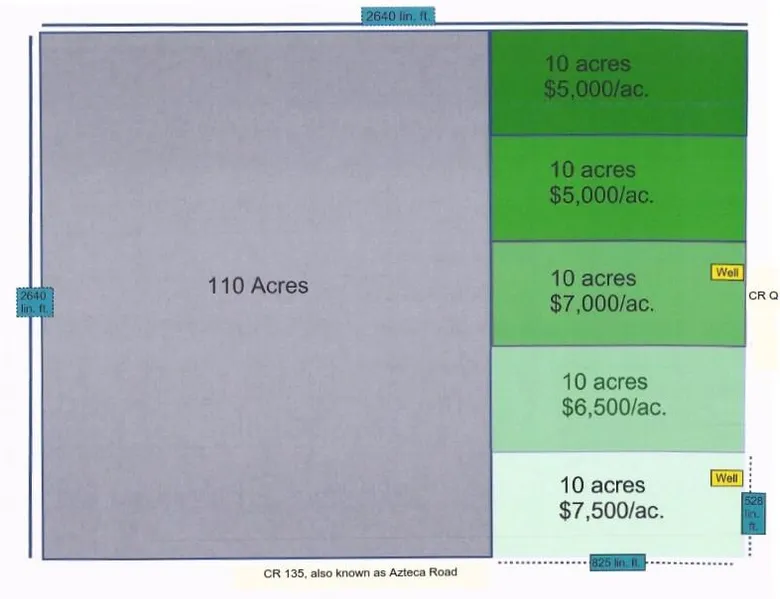 Five 10 acre tracts for sale. Tract 1, 10 acres, $5,000 per acre; Tract 2, 10 acres, $5,000 per acre; Tract 3, 10 acres, $7,000 per acre, has well; Tract 4, 10 acres, $6,500 per acre; Tract 5, 10 acres, $7,500 per acre, has well. Each tract is 528 lin. ft. by 825 lin. ft. Off of CR 135 on CR Q. No mobile homes or move-in houses. Deed Restrictions!