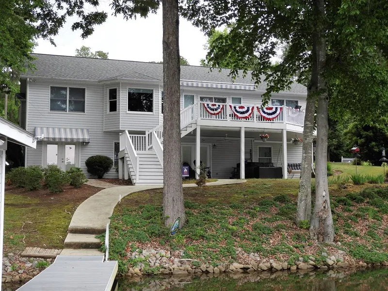 Affectionately called Admiral's Landing a waterfront parcel is approx. .88 acre & has approx. 151' of riprapped shoreline. Home is situated close to the water to take advantage of the wide cove views w/ an easy stroll to the double boathouse. Main level LR, formal DR, upgraded custom designed Kitchen in 2015, breakfast area. Upgraded Lakeside MBR w/ private MBA, custom closet w/ laundry. 2BR/BA on opposite end of main level. Finished lower level family room, undesignated room & BA. Large workshop area. Both levels offer direct access to deck/patio areas & add'l entertaining space. Lower patio hot tub and walkway to the boathouse. A Lakefront Home Tucked Away in Amongst the Upscale LKG Subdivisions. Evergreen a small, restricted community with no HOA. Good location. Portion of adjoining lot made part of this sale as is the septic repair lot.