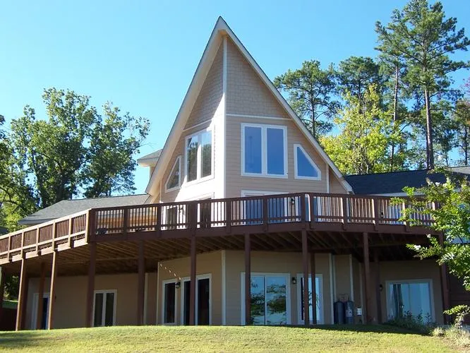 Great main lake view, deep water. Almost new home. Two fireplaces, large deck and patio on water side. Concrete drive, double attached garage. Security system, main floor master. Double Boathouse with a bar and storage room.