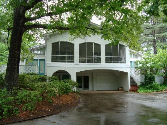 Spanish style home with arches, tile patio & screened porch lakeside. Split level with English bar, game area & full bath in basement. Upstairs is a large living room with fireplace, built-in book cases, entertainment center & dining area with mirrored wall. Two sets of atrium doors & windows lead to screened porch. Large master one end with private deck, two bedrooms in middle with full bath & undesignated room with full bath on right. Kitchen has tiled floor & counter tops, eating bar/work island, breakfast area with glass doors out to deck with hot tub. Lovely, gently sloping lot with circular cement driveway/parking. Triple, covered boathouse w/screened porch & deck. Good water depth.