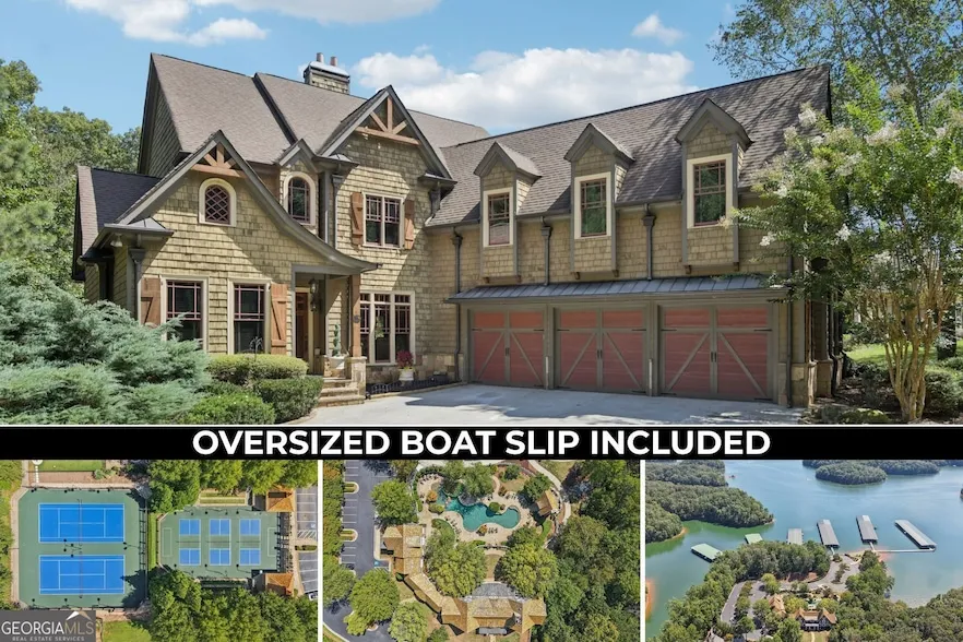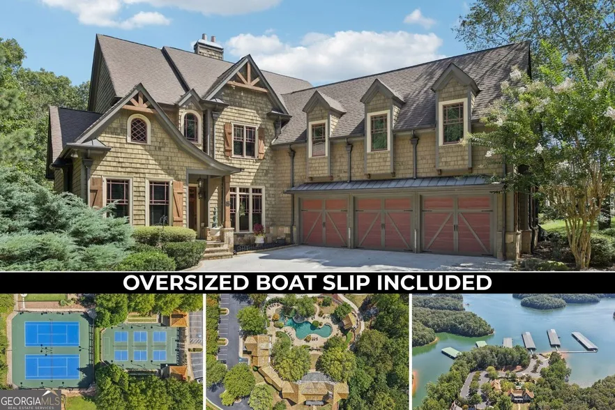 Live the Lake Lanier lifestyle in gated Marina Bay. (Premium Oversized Boat Slip Included). Where tree-lined streets, a private deep-water marina, and a resort-style clubhouse set the tone for everyday living. This custom 5-bedroom, 4 full/2 half bath residence (5,856 sq ft) was crafted to gather and impress: a dramatic two-story great room with beamed ceiling, stone-and-copper fireplace, and artisan stained-glass details flows naturally to a French-country kitchen with an oversized island, farmhouse sink, built-in refrigerator, five-burner cooktop, and custom cabinetry. The keeping room-complete with fireplace and wood ceiling-creates an intimate spot for morning coffee or game-day nights. Primary suite on main features shiplap accents, a deep tray ceiling, and a spa bath. Upstairs offers generous secondary bedrooms and flex spaces; the finished terrace level extends your living and entertaining with a large media/game room, guest suite, full bath, workshop, and abundant storage. Relax on the screened porch overlooking a private ~1.06-acre lot-ideal for a fire pit, play area, or garden. Three-car garage, hardwoods, zoned HVAC, built-in vacuum system and thoughtful millwork throughout. Marina Bay's amenities are best-in-class on the north end of the lake: a 14,000-sf New England-style clubhouse with fitness and gathering spaces, resort pool and pavilion, tennis village, walking paths, parks/playground, and a private 280-slip marina (boat slip included in the sale). All minutes to Gainesville, Dawsonville, GA-400, and North Georgia wineries and trails. Zoned for Sardis Elementary and Chestatee schools. Come home to comfort, craft, and community-your lake life begins here. Disclaimer: All information deemed reliable but not guaranteed and should be independently verified. Photos & lot lines may be virtually staged to assist buyers in visualizing the property's potential. Contact the listing agent for more information or to schedule a private showing.