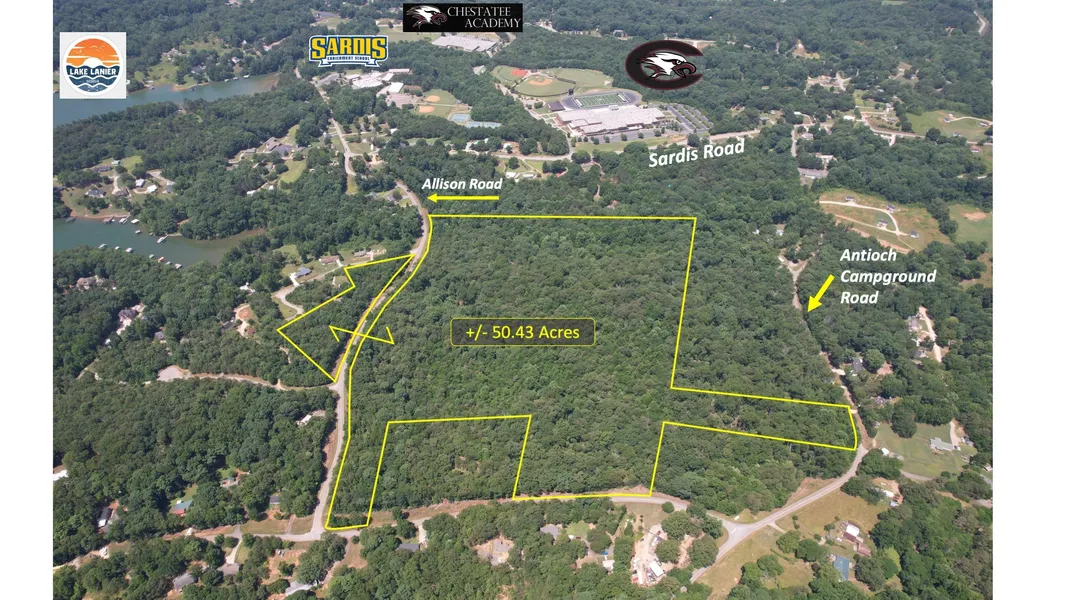 The Norton Commercial and Acreage Group is proud to present this rare opportunity for a Hall County/Chestatee residential development walkable to Sardis Creek Park on Lake Lanier. The subject property is +/- 50 acres and is located less than half a mile from Chestatee High School, Chestatee Academy, and Sardis Enrichment School. The property is currently zoned AR-III, and is well situated for a residential development with access to public water and likely public sewer as there is a sewer force main nearby. Site has ample frontage on Antioch Church Road, Looper Lake Road, and Allison Road just off Sardis Road allowing for multiple access points. The property has rolling topography and one water feature on the West property line that should not significantly affect the development of the subject property.