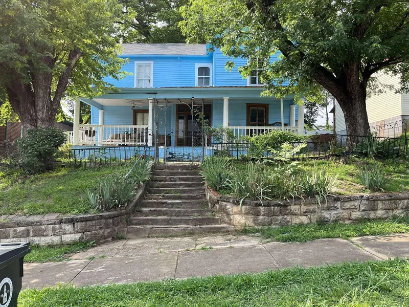 Investor Special - Historic Home with Major Upside Potential!This is your chance to own a classic two-story home with strong bones, character, and great curb appeal, located on an elevated lot with mature trees, stone terracing, and a welcoming front porch. The blue exterior, large wraparound porch, and prominent front steps give this property standout street presence. Inside, the home is in various stages of renovation, offering a blank canvas for your vision. Some rooms have already been cleared to the studs, while others retain partial finishes and fixtures. You'll find hardwood floors, tall ceilings, and vintage fireplace mantels just waiting to be brought back to life. One of the upstairs rooms features exposed lath and open joists, hinting at a past demo -- perfect for reconfiguring to suit modern needs.