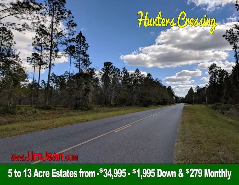 Hunters Crossing consists of 5 to 13 acre estates located in White Springs, Florida. Each estate fronts on a county maintained paved or dirt road. There is no requirement or timetable to build. However when you decide to build it must be 650 square feet or larger. Modular homes and mobile homes are allowed providing they meet the minimum square footage and are 7 years of age or newer when initially placed on the land. Farm animals are permitted with the exception of pigs. Camping is permitted on a limited basis.