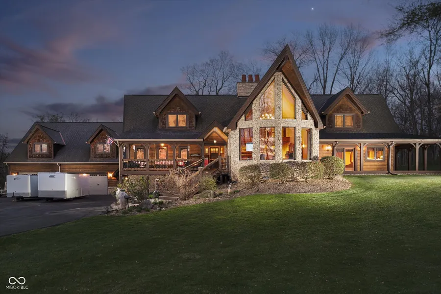 Calling all car enthusiasts and nature lovers! It doesn't get better than this truly one-of-a-kind property! Situated on a gorgeous wooded 2 acres with a stocked pond and surrounded by mature trees. Inside are soaring ceilings and windows letting in all the natural light and beautiful views of the grounds. The main home has 4 bedrooms that could all be primary suites! Spacious main level primary suite is a true retreat with a spa-like bath and access to a wrap around covered porch overlooking woods. Impressive floor to ceiling stone fireplace houses 2 gas fireplaces. The lower level leads to a jaw dropping 40x49, 8 car garage with 3 overhead doors with retractable screens, office space, 13x09 parts storage, and half bath. Garage also has a separate entrance from the outside. Above the garage is a carriage home complete with spacious living space with soaring ceilings including 2 bedrooms...